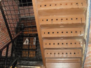 Suicide screens filled the gaps from floor to floor so that no one could throw themselves (or a guard) over the staircase. Our tour guide also pointed out the holes in the backs of the stairs, which served their own purpose. The holes allowed the guards to see the shoes of anyone going up or down the stairs, which was telling, since prisoners and guards wore different shoes.