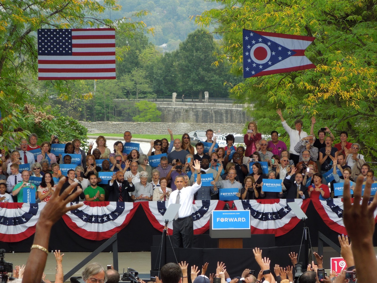 In order to get to the Seasongood Pavilion in Eden Park where the President was scheduled to speak, we had to park up a steep hill, walk down the hill past the pavilion and approach from an even steeper angle. We didn’t mind. We certainly understood the need for security and closed-off streets. What surprised us was a woman who came down the hill and waved us over to her SUV. She offered us and four other women a ride up the hill. We gratefully accepted and jumped in her car. Another van pulled over and picked up some other event-goers.