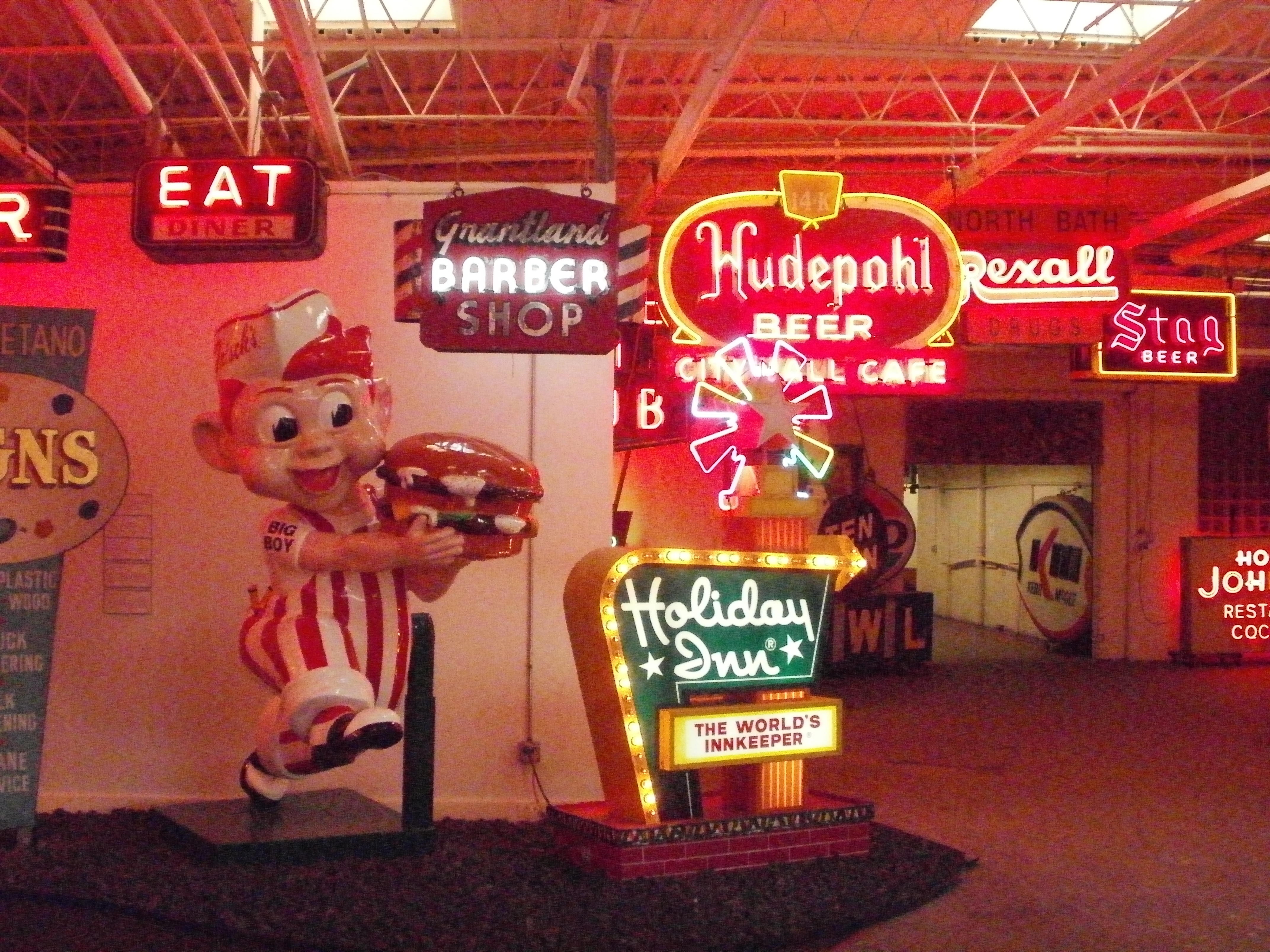 He had big neon signs from Holiday Inn, Dutch Boy Donuts, Fergi Car Wash, Frisch’s, Rexall, McDonald’s, a really neat art deco Pentecostal church sign, and many, many others from all over the country. Swormstedt’s zeal actually forced him to move his museum from its original home in the Avondale section of Cincinnati to a larger 20,000 sq. ft. location in Camp Washington, where he could erect big signs like a 21’ sign of Howard Johnsons, which seemed to base its brand theme on “Simple Simon Met A Pieman, Going To The Fair.” It had a pie man holding a pie, and sign pointing to the fair. I would have never noticed.