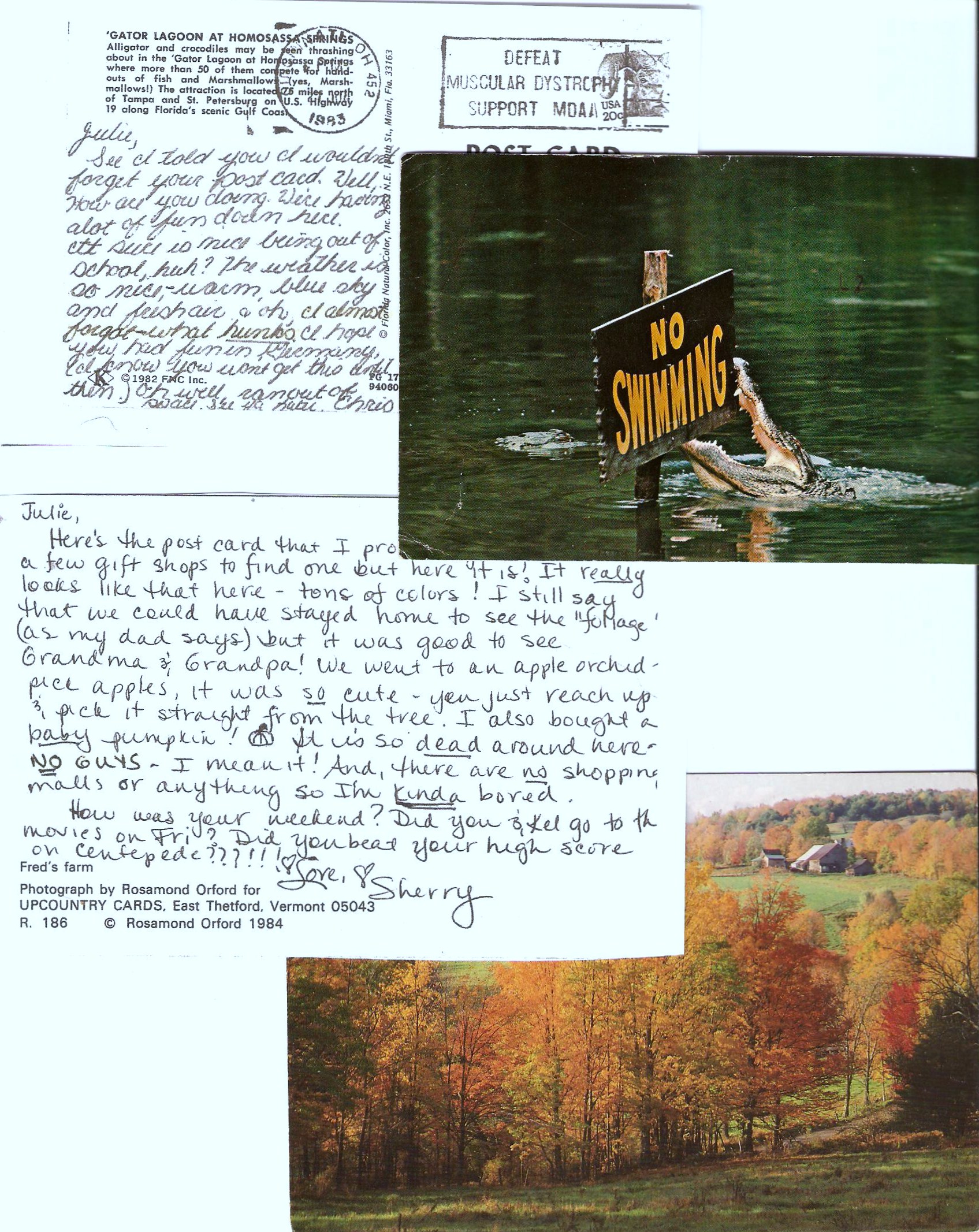 I’m getting ready to go on vacation and a friend of mine asked me to send her a postcard. Of course, I will! I love sending postcards. It prompted me to look through some old postcards that friends have sent me. Here are two from my junior high school days. I couldn’t help but notice that both Sherry and Chris had to comment on the status of finding cute guys (hunks) during their family vacations. 🙂
