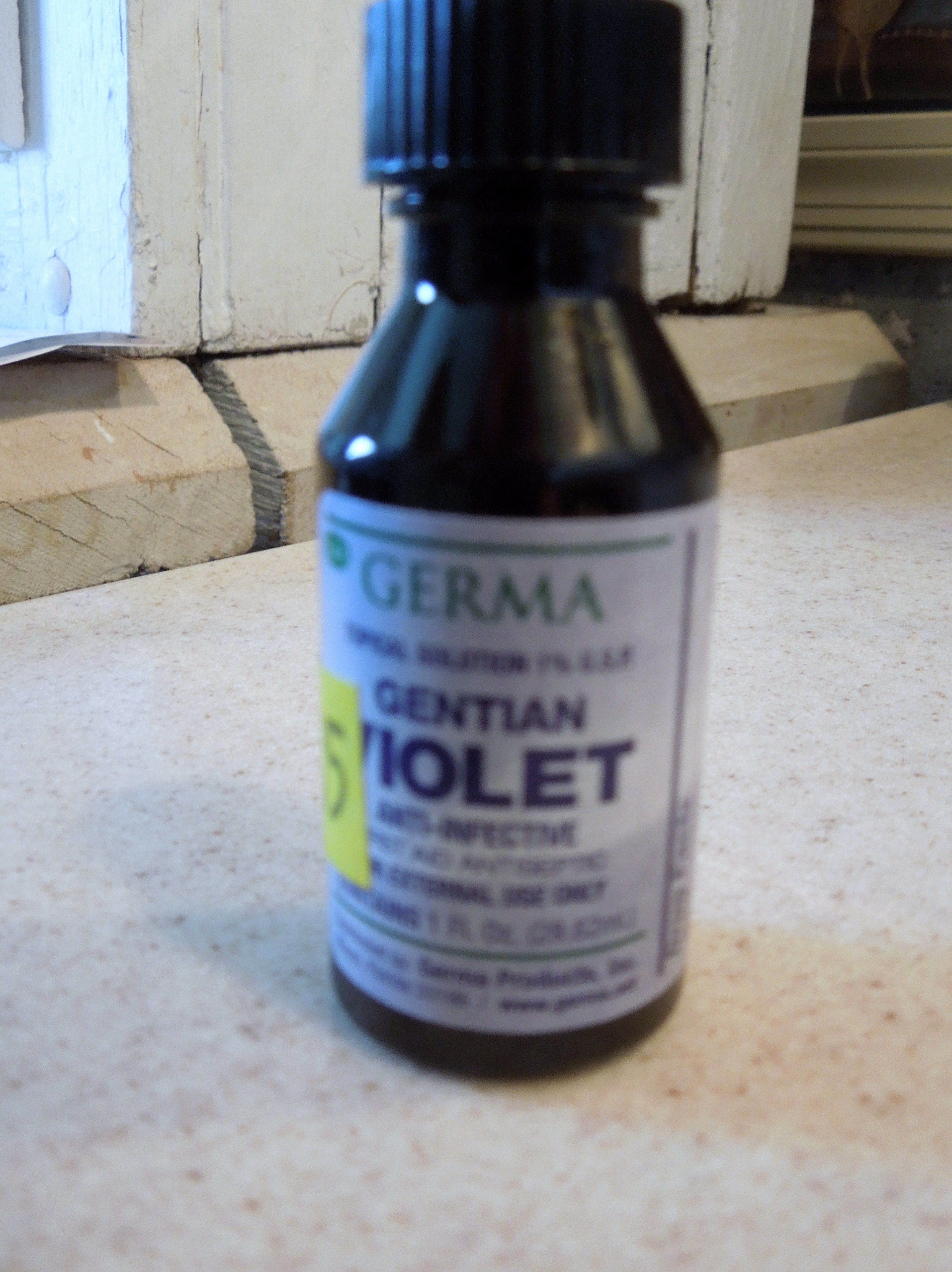 We have Gentian Violet in our medicine chest! I make a “blue juice” concoction for our dog’s ear infections. It works! The last time I made a batch, I accidentally spilled some of the violet onto our yellow formica counter top. I got a damp rag to clean it off, and everywhere the violet touched, it took the yellow color out of the formica! I have white patches now. That is some amazing stuff.