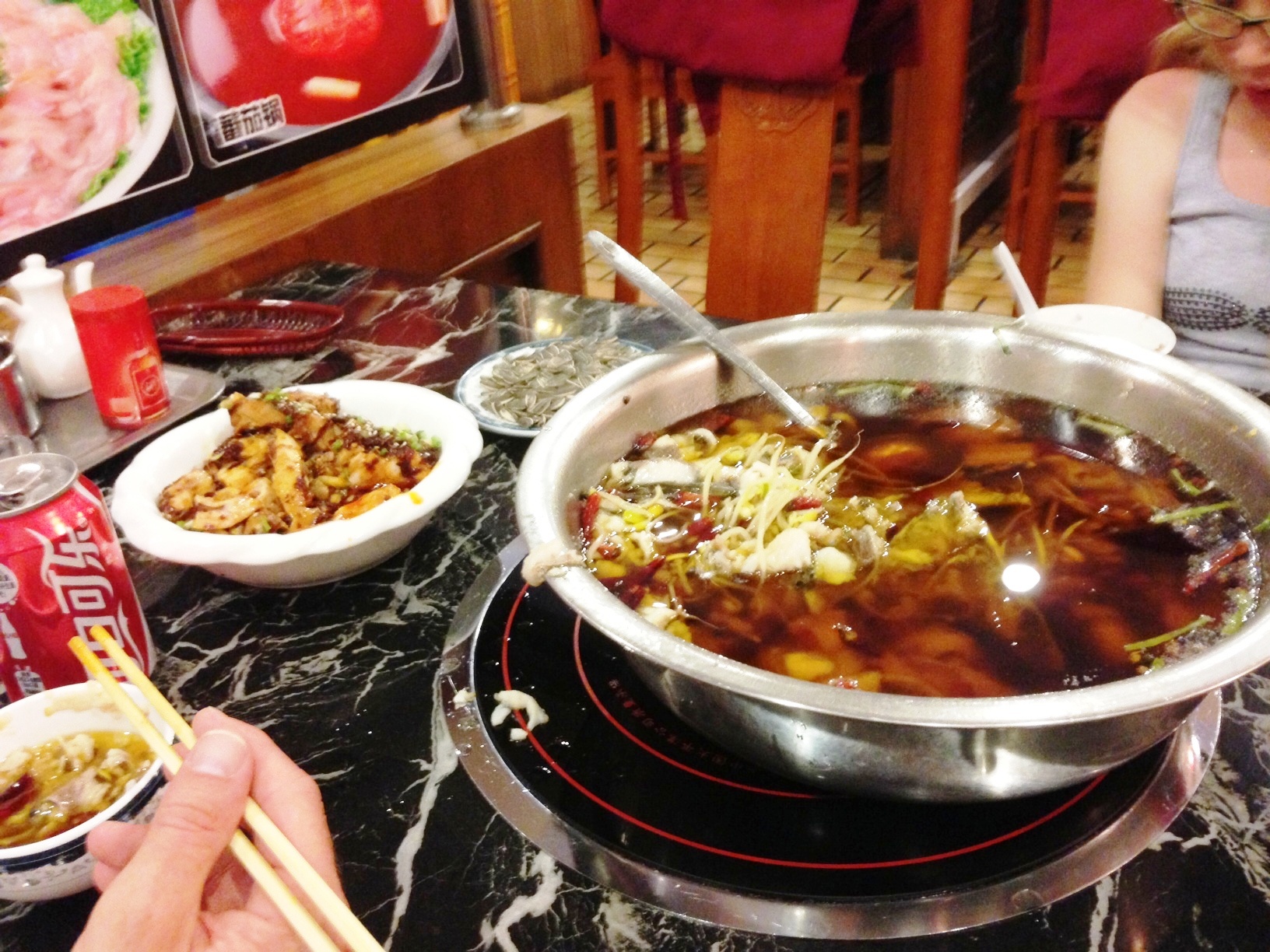 Soon, a HUGE bowl of carp in chili oil was set on our table. I realized then that they were trying to ask me what ingredients to add to our hot pot. Luckily, they figured it out for me. It was delicious, but way too big. Especially considering the other food we’d ordered along with it.