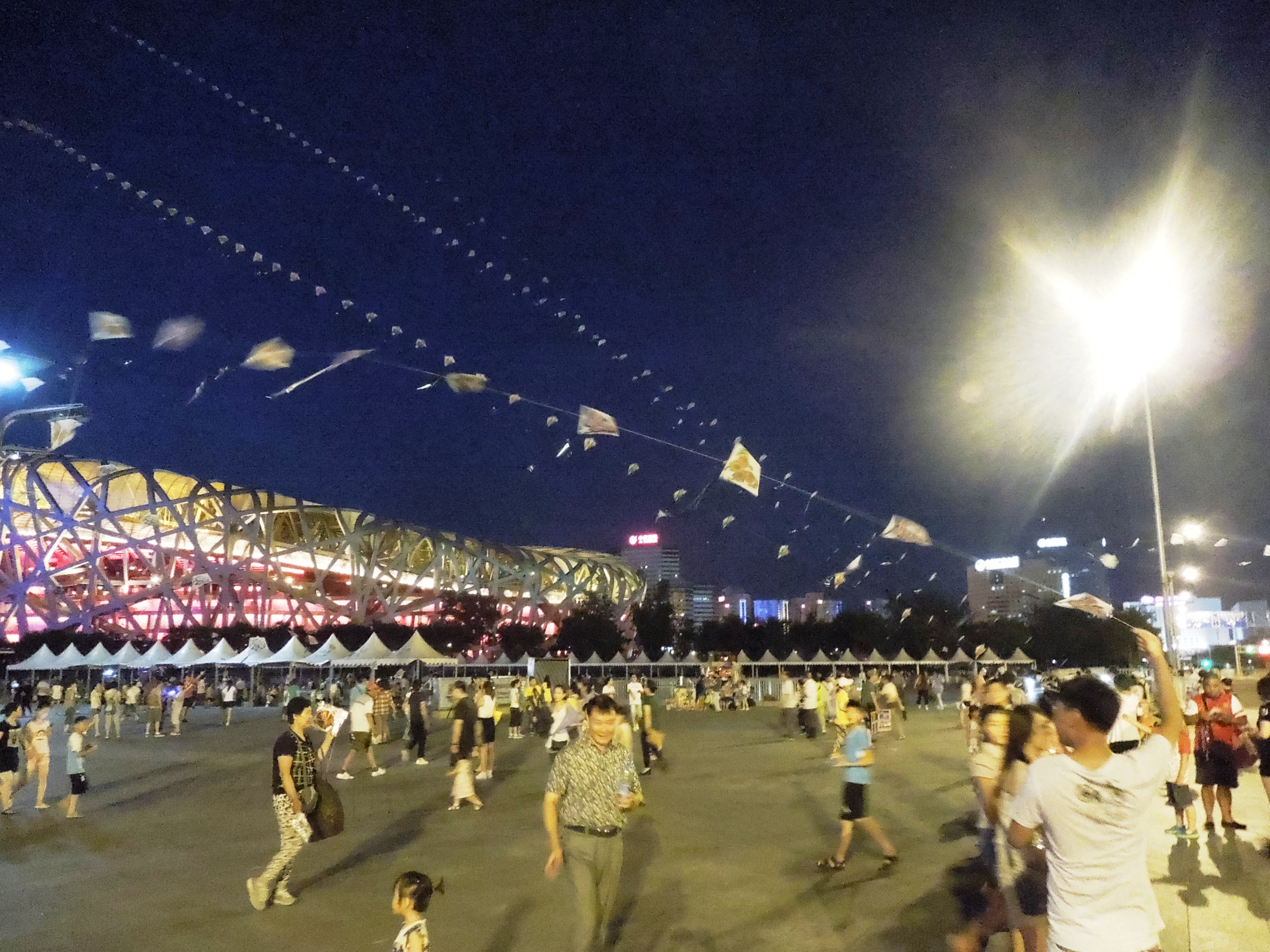 The Olympic Green at night was like a great big impromptu party. There was music, food, and all sorts of vendors selling trinkets and flying kites. They threw spinning light toys into the sky. Children ran and laughed and played. The Bird’s Nest and Water Cube were brilliantly lit, as was the platform structure that had housed the torch.