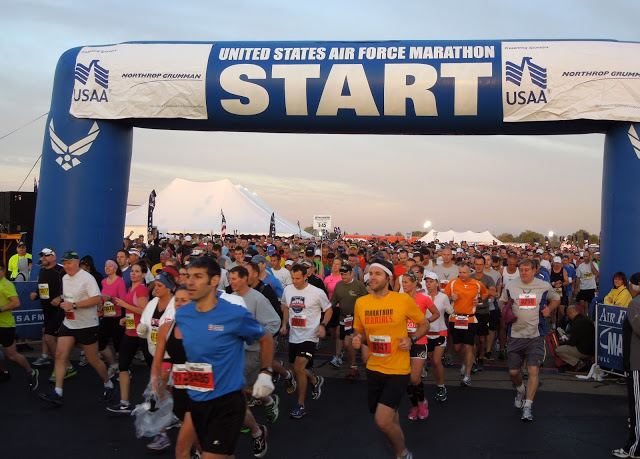 Yesterday was the Air Force Marathon at Wright-Pat AFB in Dayton, Ohio. All 13,000 spots sold out. People from all 50 states came to run the full marathon, half-marathon, or 10K, including my husband, Mike. This was Mike’s second marathon and my 4th time to be an Air Force Marathon spectator, having watched my son run it twice before Mike. After four times, I am still ill-prepared for the spectacle before me.