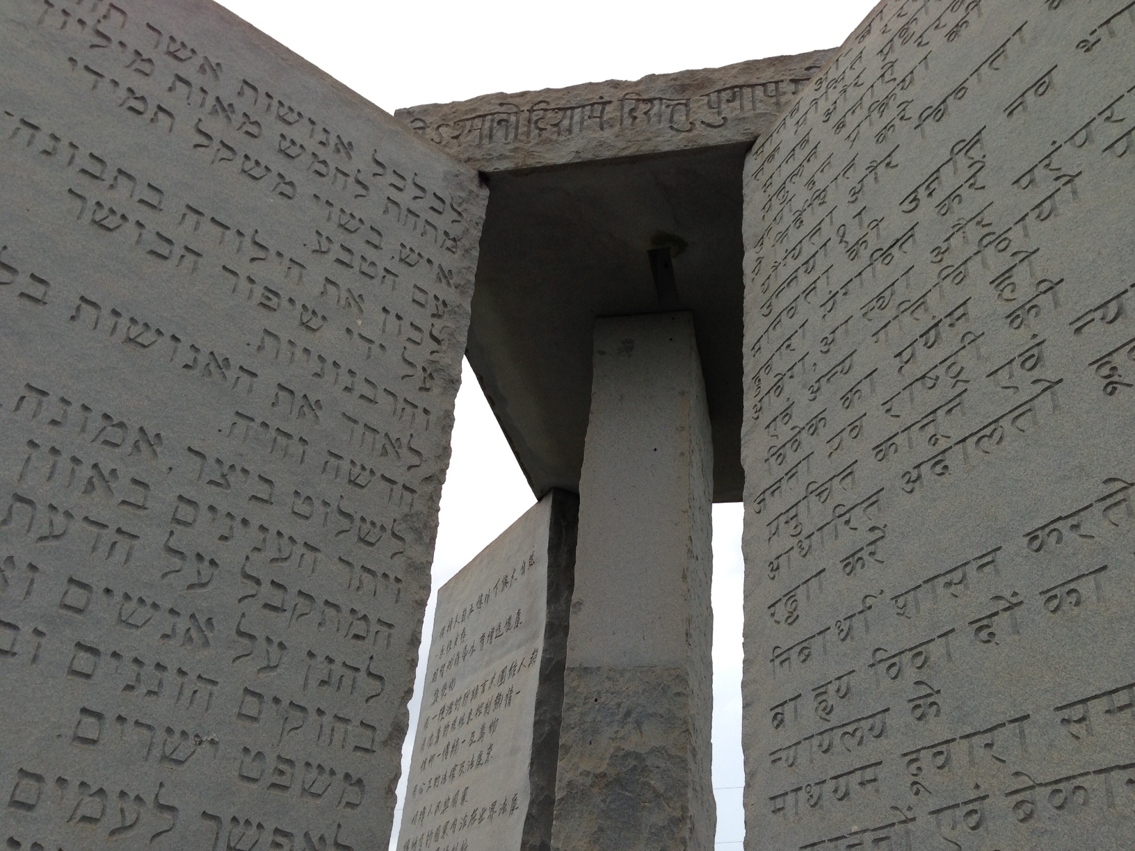 The four slabs contain 10 ‘guidestone messages’ written in English, Swahili, Hindu, Hebrew, Arabic, Spanish, Chinese and Russian. The messages are about peace, global sustainability, etc., etc. I think it’s supposed to be inspirational. It’s not.