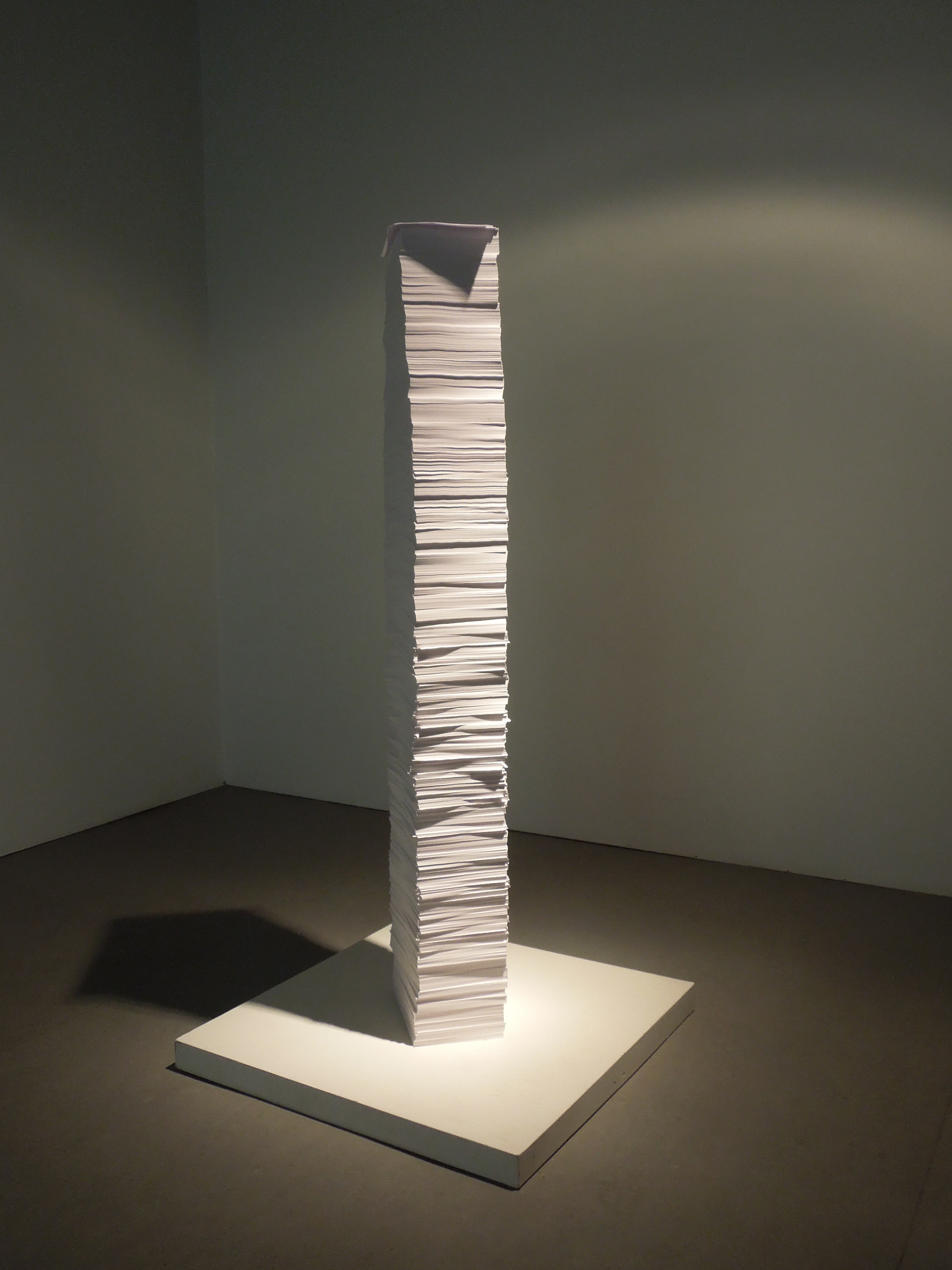 The installation image below shows the 6 feet high stack of A4 paper also titled The Normalisation of Deviance as part of the installation. This equates to the findings by a Chicago-based researcher of the number of global positions taken through the use of algorithms on one stock in one nanosecond. The total was 14,000 and equates to this amount of paper if this data was printed out.