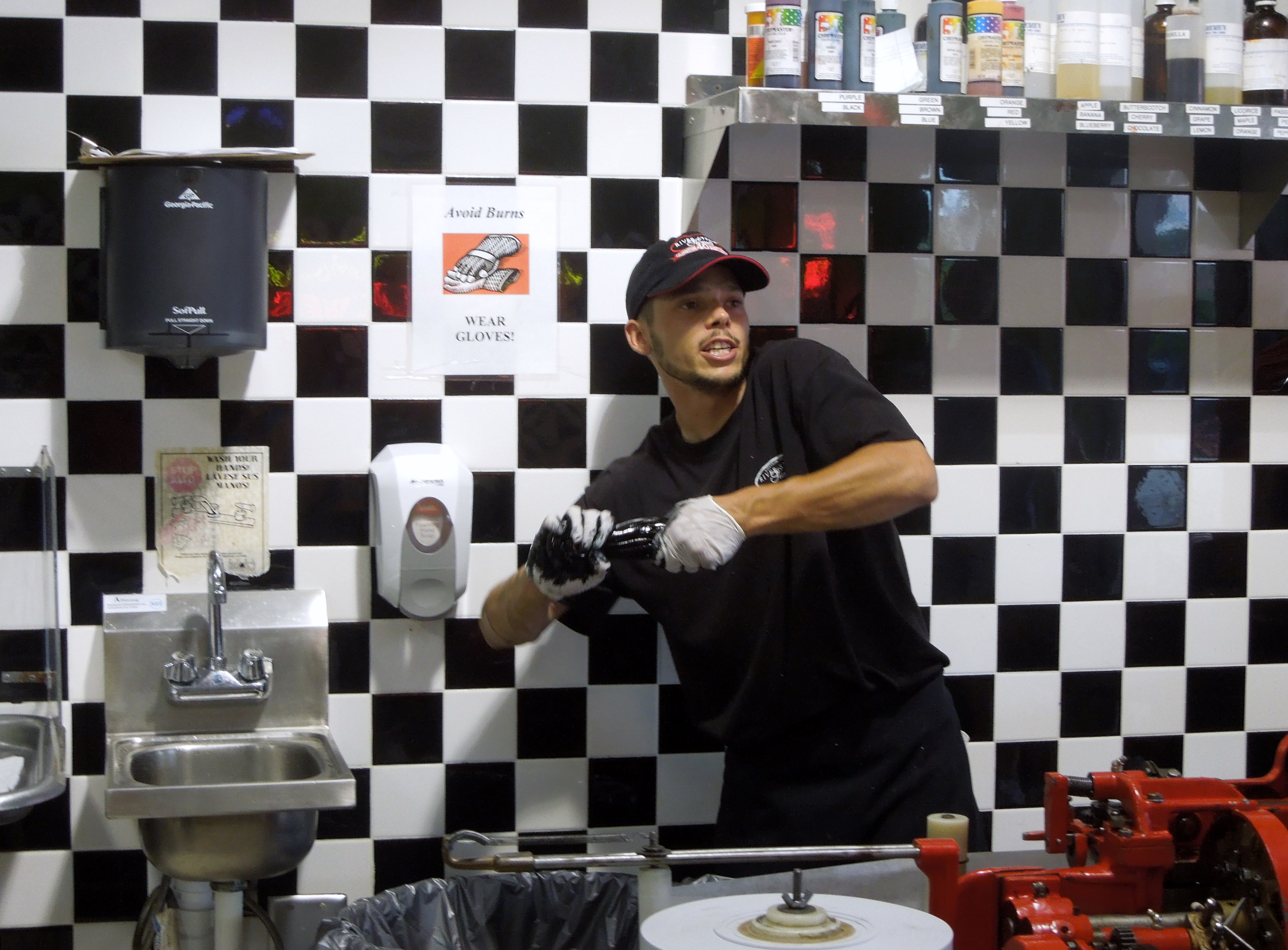 We watched our guy thread the taffy through the machines that aerate it and mix the food coloring in. It reminded my mother of her childhood days when people pulled taffy at home. I tried to visualize how you’d handle a sticky mess like the one on the machines. I didn’t think I’d like to try it, but at the same time, could imagine a family talking and socializing as they folded the taffy together and pulled it apart. Maybe I would have liked to do it after all.