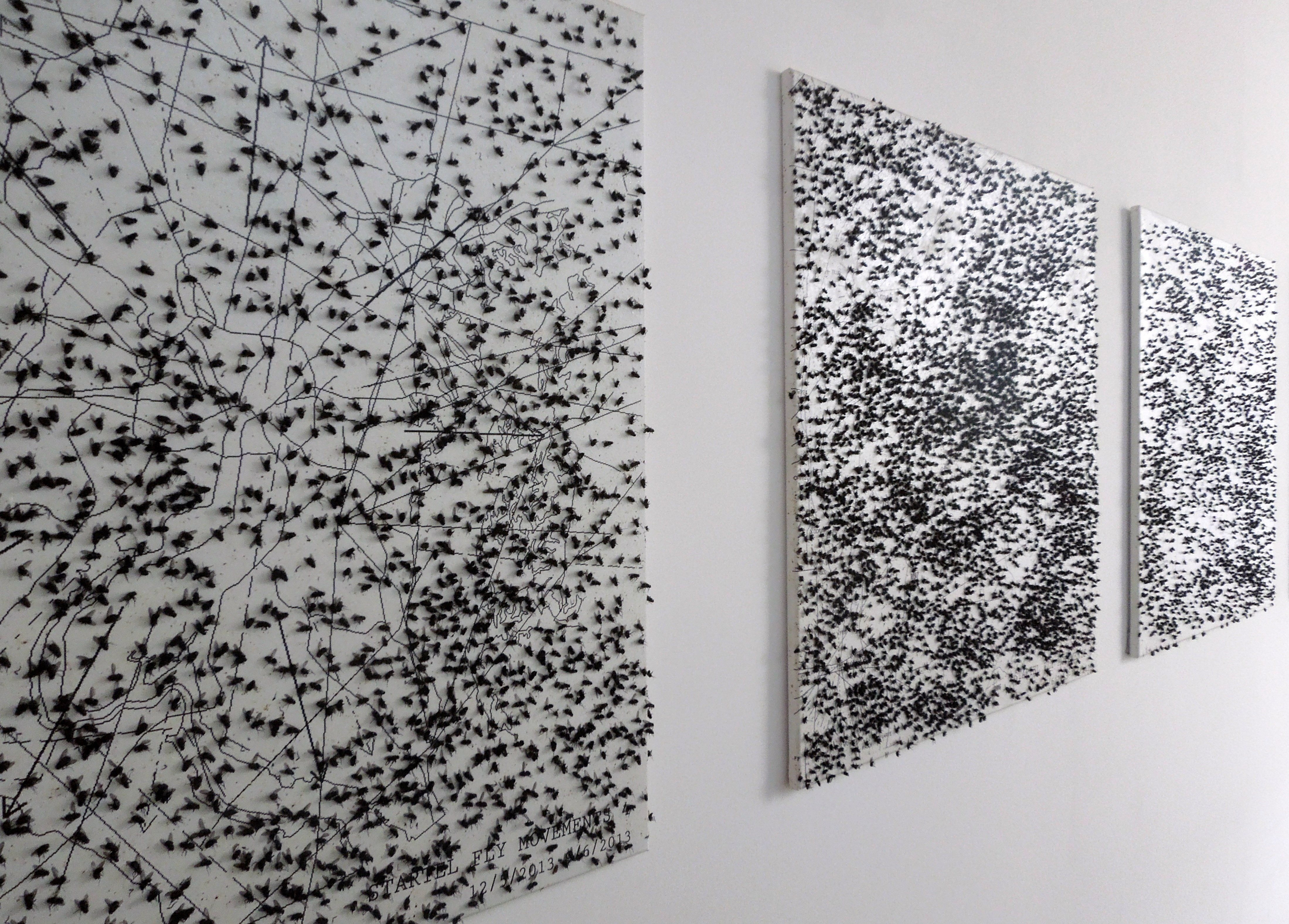 I moved on and was intrigued by canvases covered with dead black flies. It was later explained to me that the artist used a wall-sized canvas depicting the four winds and had the flies walk through paint, making patterns. It was believed that they would gravitate more toward one of the four winds, but it didn’t appear to have turned out that way. Next to the wall-sized canvas were smaller white canvases with more flies stuck to them. I didn’t know what to make of it.