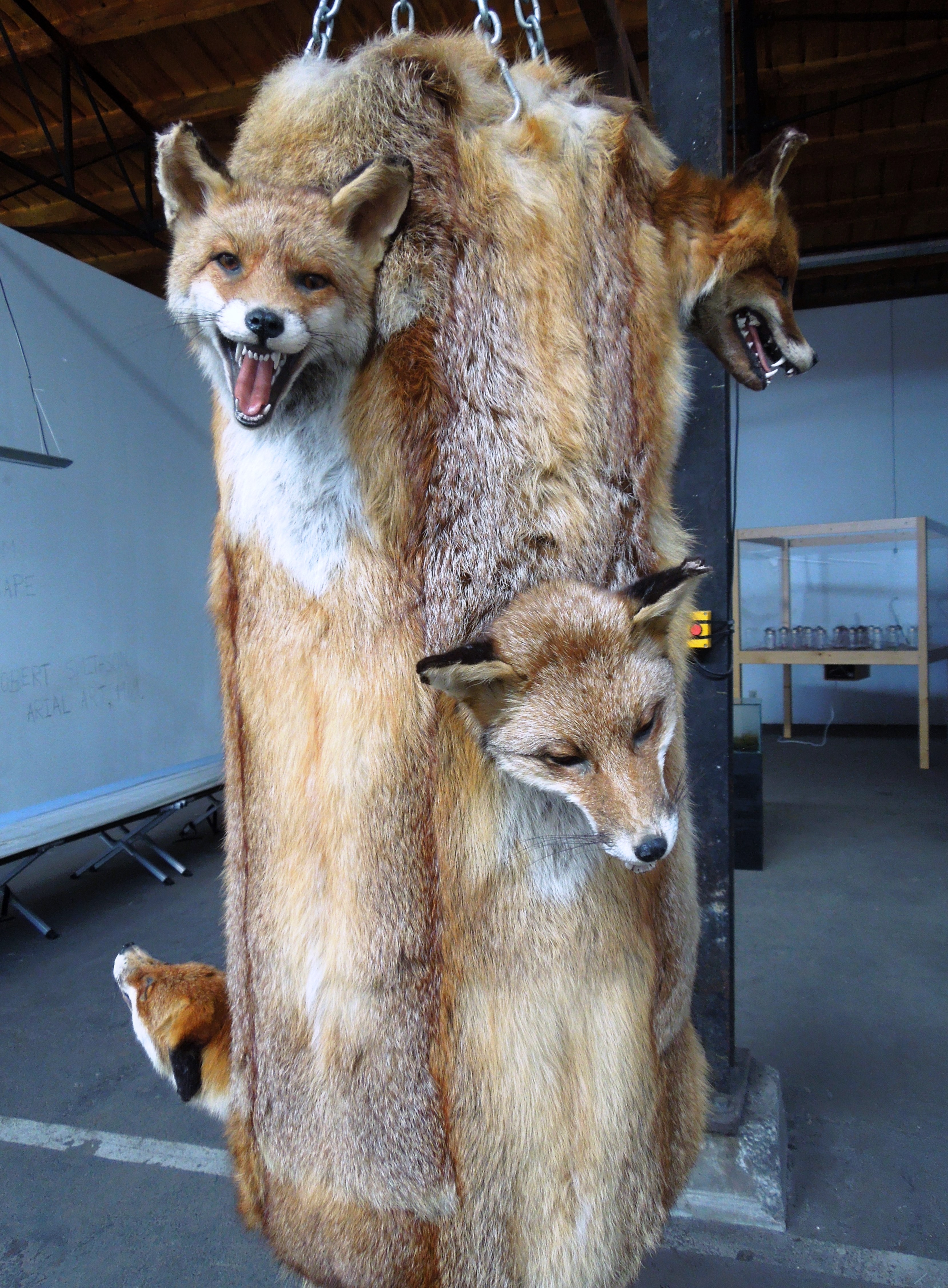 Except – I wasn’t sure how to feel. Confused. Disturbed. Curious. Contemplative. Off-balance. Sickened. Shocked. The art elicited so many emotions. For instance, these foxes: