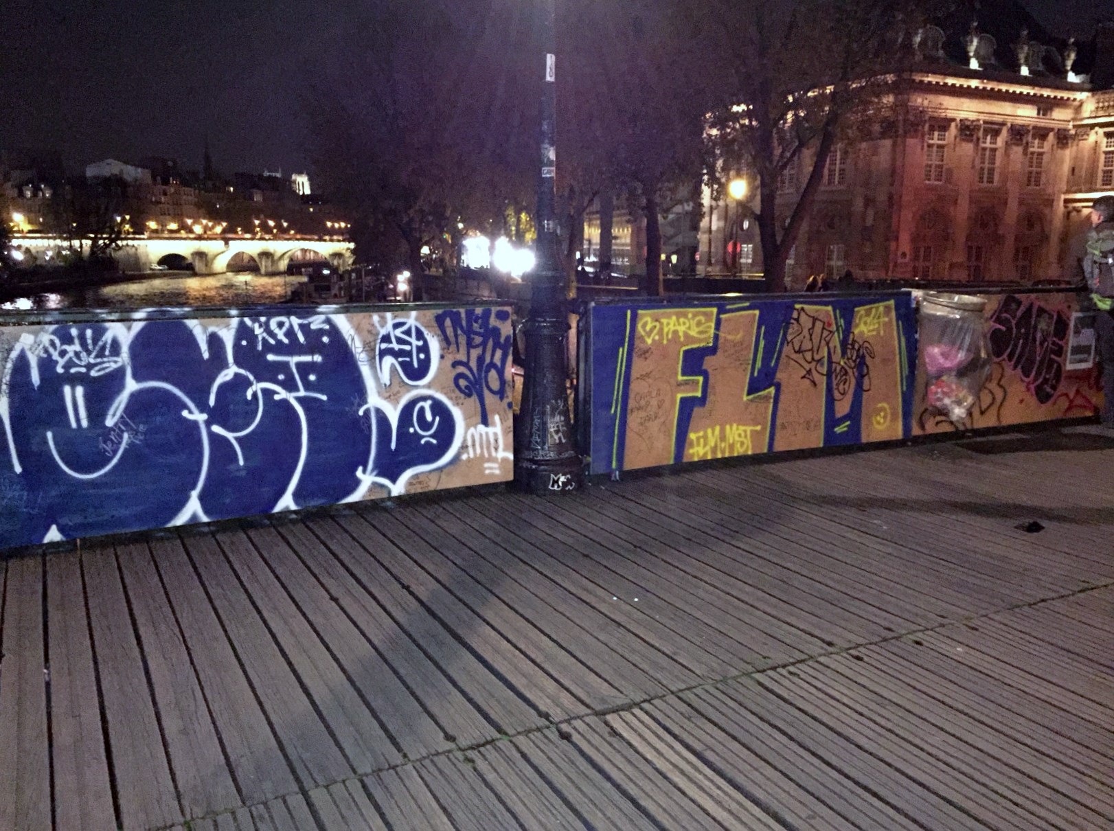 Still, hawkers are set up on the bridge selling a variety of padlocks to young lovers. While I was there, I saw three more locks attached to the bridge. I think they’re probably only going to be there temporarily. The plywood signs are on the wall: the locks are going down. The next time I go to Paris, I expect to see a completely different scene on this bridge. As evidenced in my three visits so far, things change.