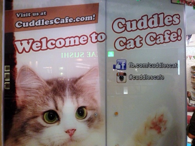 There was a sign posted outside. Cuddles Cat Cafe was actually looking for more cuddlers. They needed volunteers to commit to a couple of months and they could make $6 or $7/hour based on how many hours a week they spent there. (Which doesn’t seem like volunteering. And didn’t match with how I’d thought about cat cafes. I thought the whole idea was that patrons would come in, have a cup of tea and play and cuddle with the cats. I had no idea it could be a paying job.)