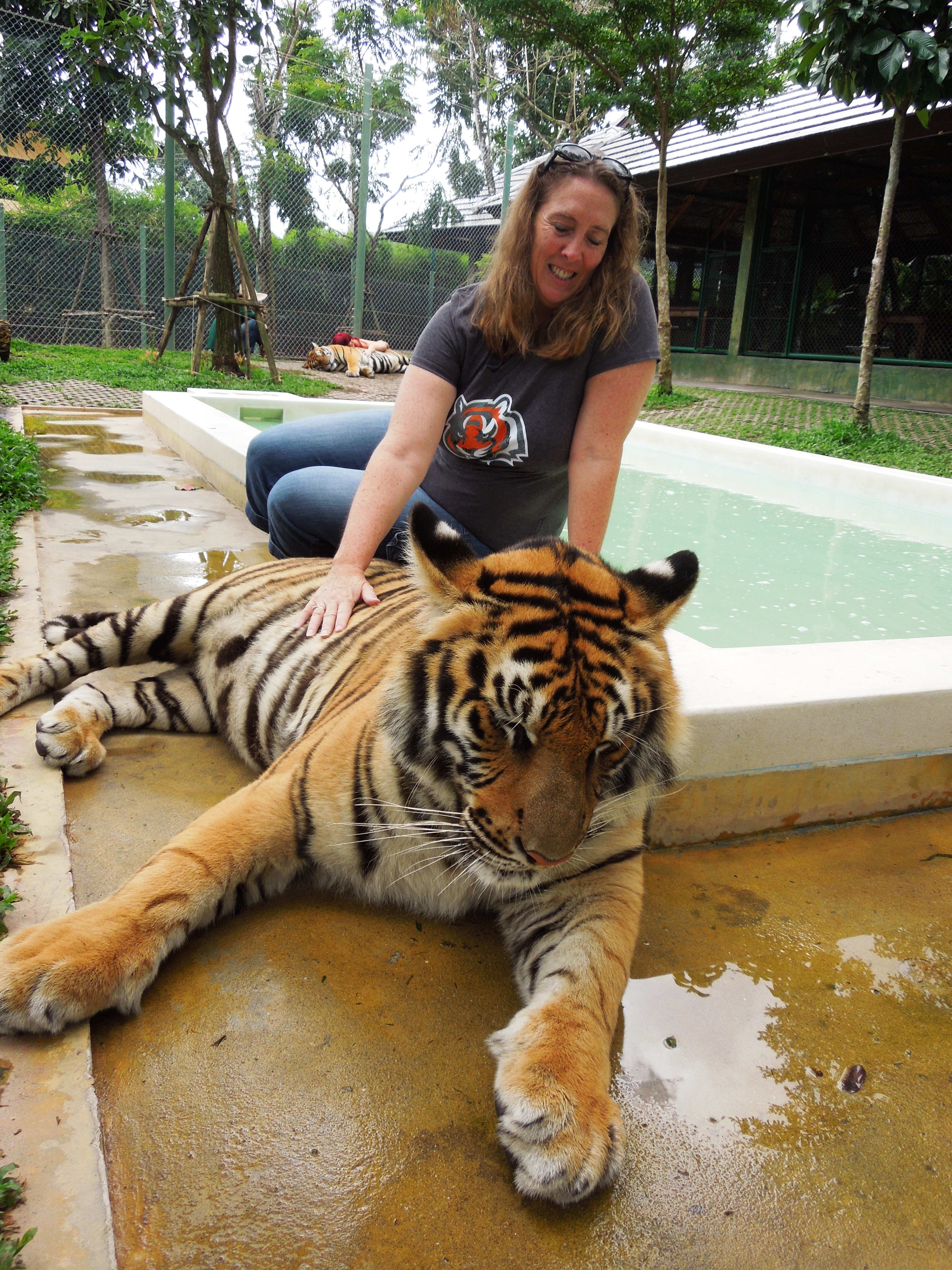 I complied and made a goofy attempt at tiger claws behind the back of this gorgeous tiger, but couldn’t stop laughing at the absurdity. It’s best the tiger had his back to me. I looked ridiculous and he surely would have turned around and bitten me if he’d seen how “fierce” the laughing hyena woman posing behind him was.