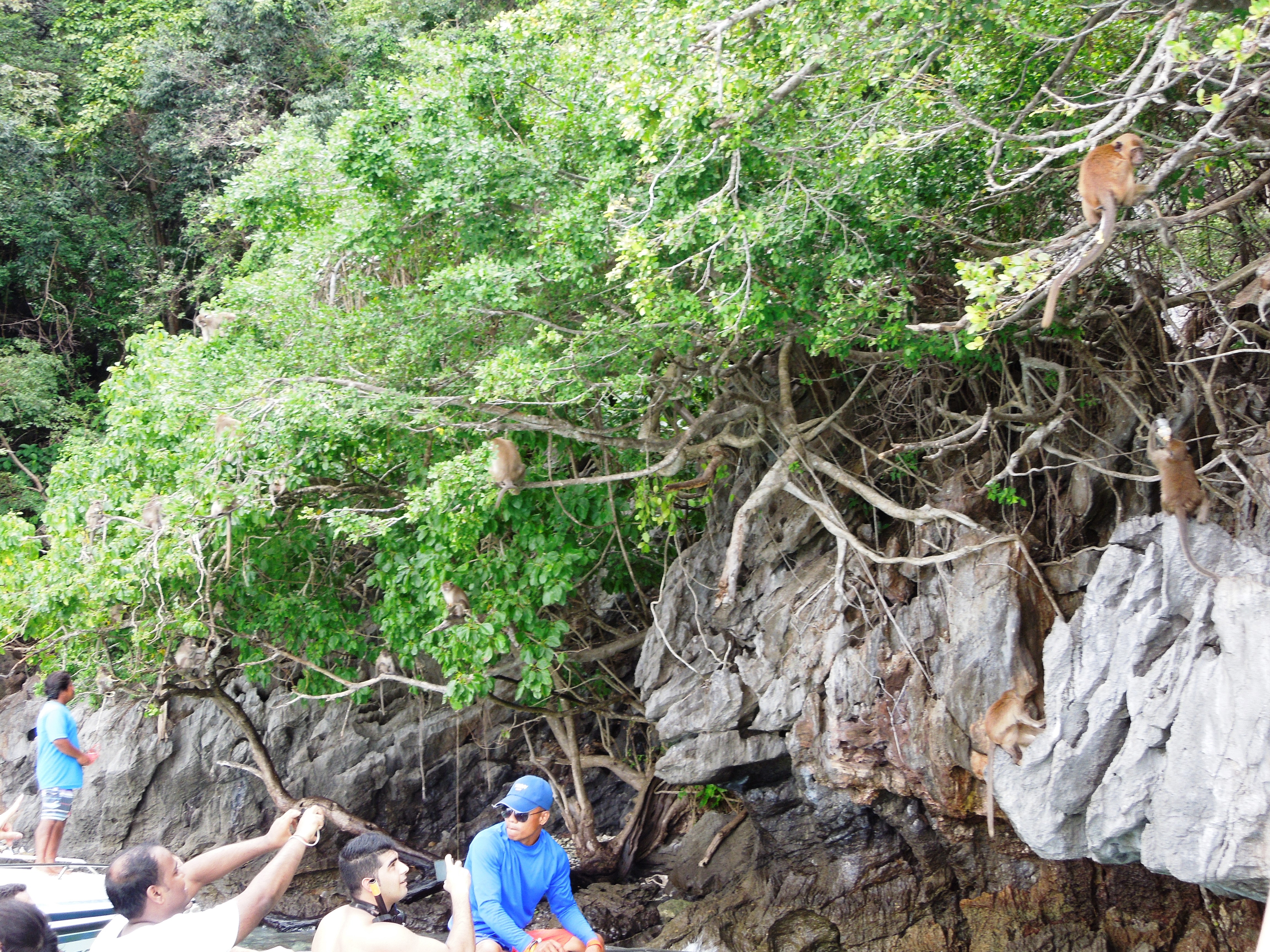 The Phi Phi Islands are gorgeous! Really spectacular. Rock formations jutting out of pale seafoam green/turquoise water. So beautiful. We pulled up to Monkey Island, but Madame Jasmine said, “Monkeys are bad. They bite. We stay in boat and take pictures.” So we did.
