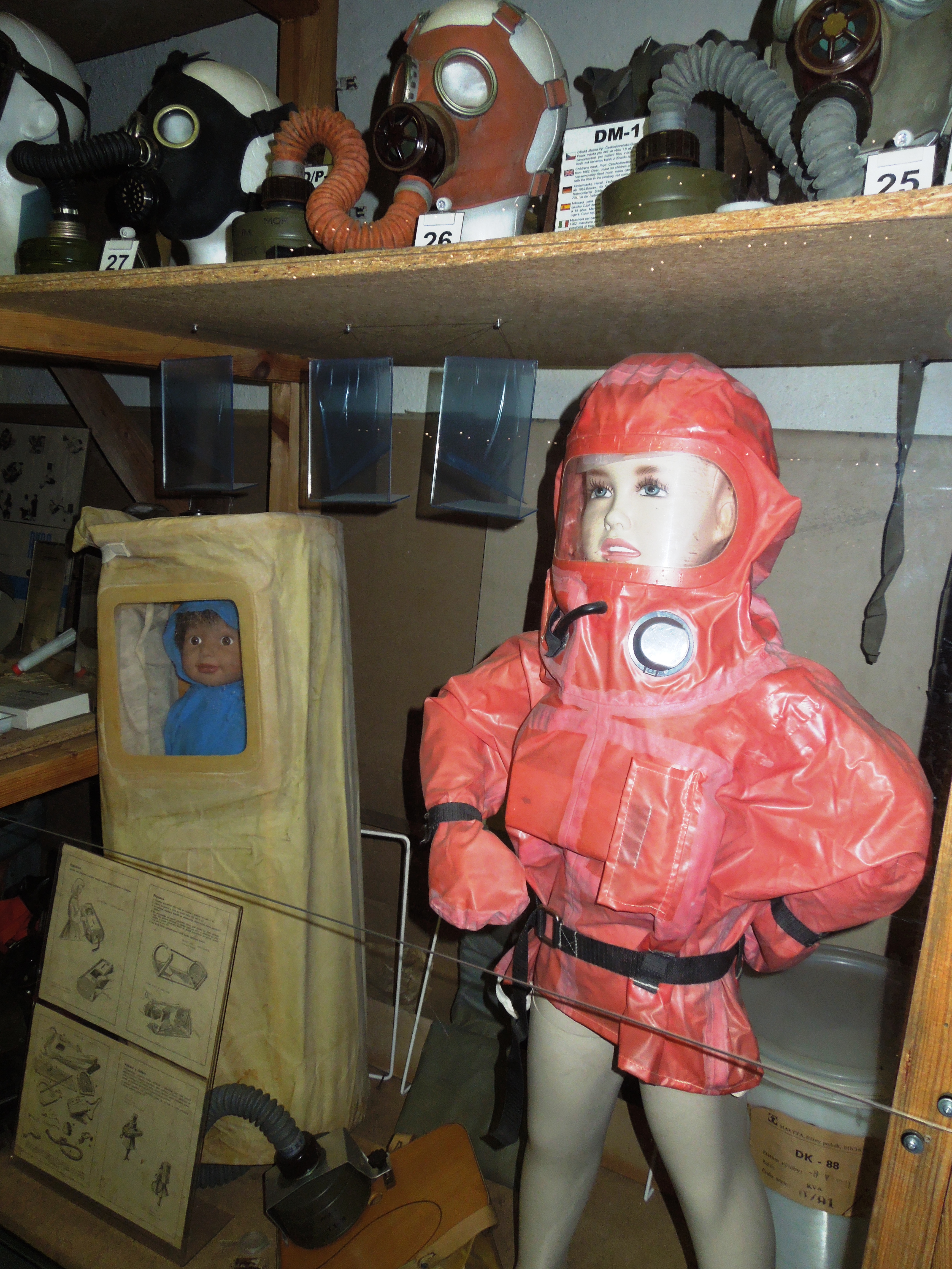 We walked down a few flights of stairs into a bunker that would have never really protected people from a nuclear attack. We entered the narrow museum displays where Jacob gave us an overview of the propaganda of the time. Most of it was absurd: like the idea that placing your baby in this makeshift box and pumping air in every 3 minutes would keep your baby safe and alive, or that in the event of a nuclear attack, it was advised to get under a desk or table and cover your head. (Same thing American children were taught, too.)