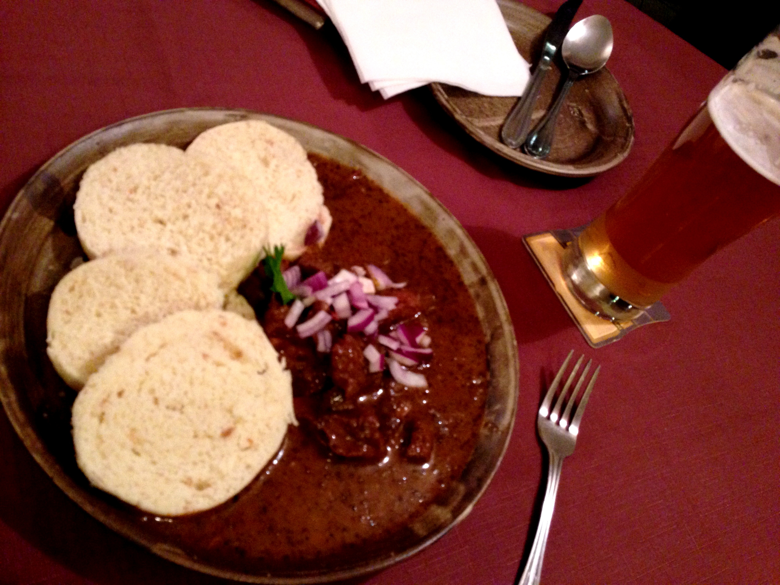 Czech goulash is nothing like the “Hungarian goulash” I had as a kid. What I had in Prague was more like a beef stew with either red or white onions chopped on top and “noodles” served on the side. The noodles were those round pieces that I’d mistaken for bread. It tasted like a potato bread dumpling to me, and the beef tasted like it had been stewed in wine. Delicious every time I got it, though I preferred the tanginess of the red onion on top vs. white.
