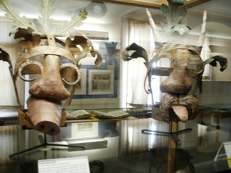 In addition to the masks there were greatly oversized necklaces of wooden dice for those caught cheating at games or who were unable to pay their debts. There was an enormous rosary with beads the size of softballs (I can’t remember if they were iron or wooden) that was worn as punishment by those who fell asleep in church or who didn’t show up to church. And they knew, because everyone had an assigned seat, so you’d better have been in it and reverently paying attention!