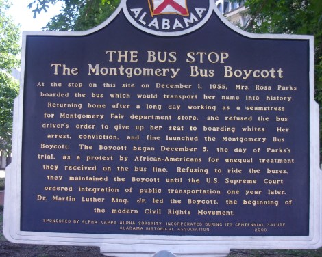 There’s the corner where Rosa Parks sat waiting on a bench before boarding that infamous bus. A plaque commemorates the spot. And someone has installed a protected Bible on the small patch of land there as well. If you’re not familiar with Rosa Parks, she was the black woman who boarded a bus and then refused to give up her seat for a white man when the bus driver told her to. The bus driver had a policeman arrest her and remove her from the bus; an action that incited the Montgomery Bus Boycott and brought world attention to the injustice of segregation still happening in Montgomery at the time.