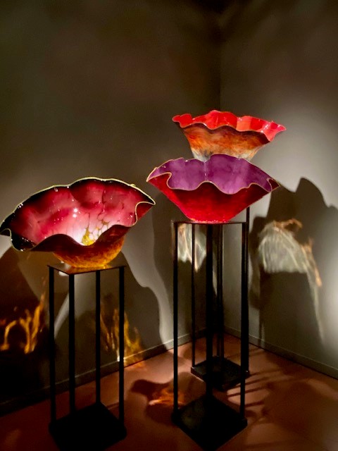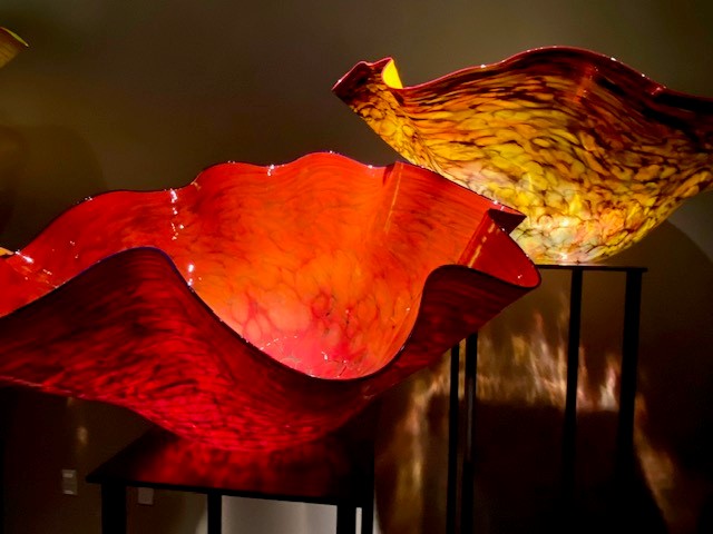 Chihuly was born in Tacoma, WA and took part in the first glass program offered at the University of Wisconsin. From there, he studied and later taught at the esteemed Rhode Island School of Design. After he won a Fulbright scholarship, he traveled to Italy to learn from renowned glass blowers there and observed a team approach to creating glass sculpture. It had a huge influence on his art. I highly recommend staying for all three documentary videos about Chihuly and the evolution of his work. You’ll have a much better appreciation for his work.