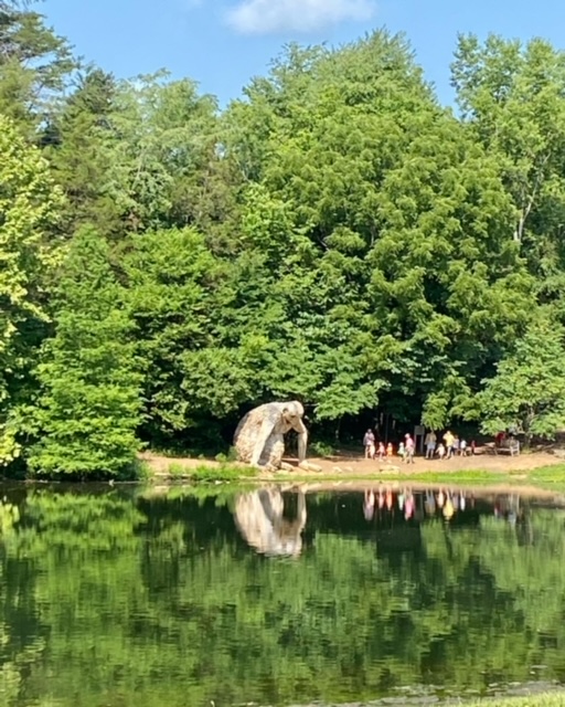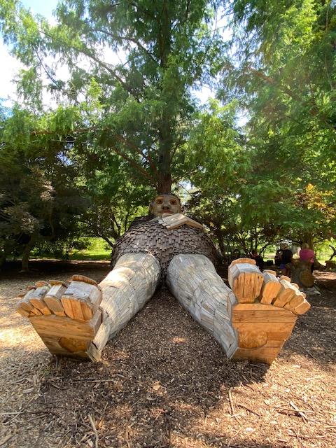 I sucked in my breath and hurried toward him for a closer look. I knew these forest giants were the work of a man named Thomas Dambo who used recycled materials to create whimsical wooden creatures. I was immediately charmed. Little Nis seemed so playful and approachable; the children visiting Bernheim Forest were as enchanted as I was.