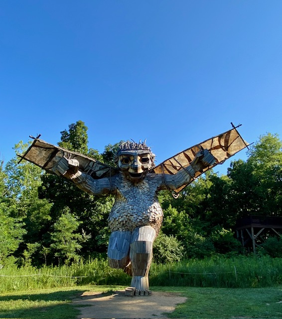 Dambo’s whimsical creation ties in nicely with the bird theme of Aullwood Audubon. The first stop on the Troll trail is at a bird’s nest where children can climb and play. Birds, nature and conservation are all reflected in the trolls’ story as written by Thomas Dambo.