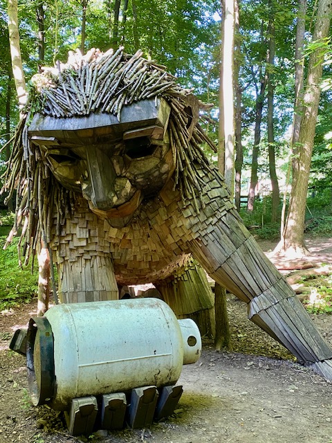 A quick Google search took me to Thomas Dambo’s homepage. A self-described dumpster diver, Denmark-born artist Thomas Dambo has created a worldwide troll-hunting phenomenon! Who knew?