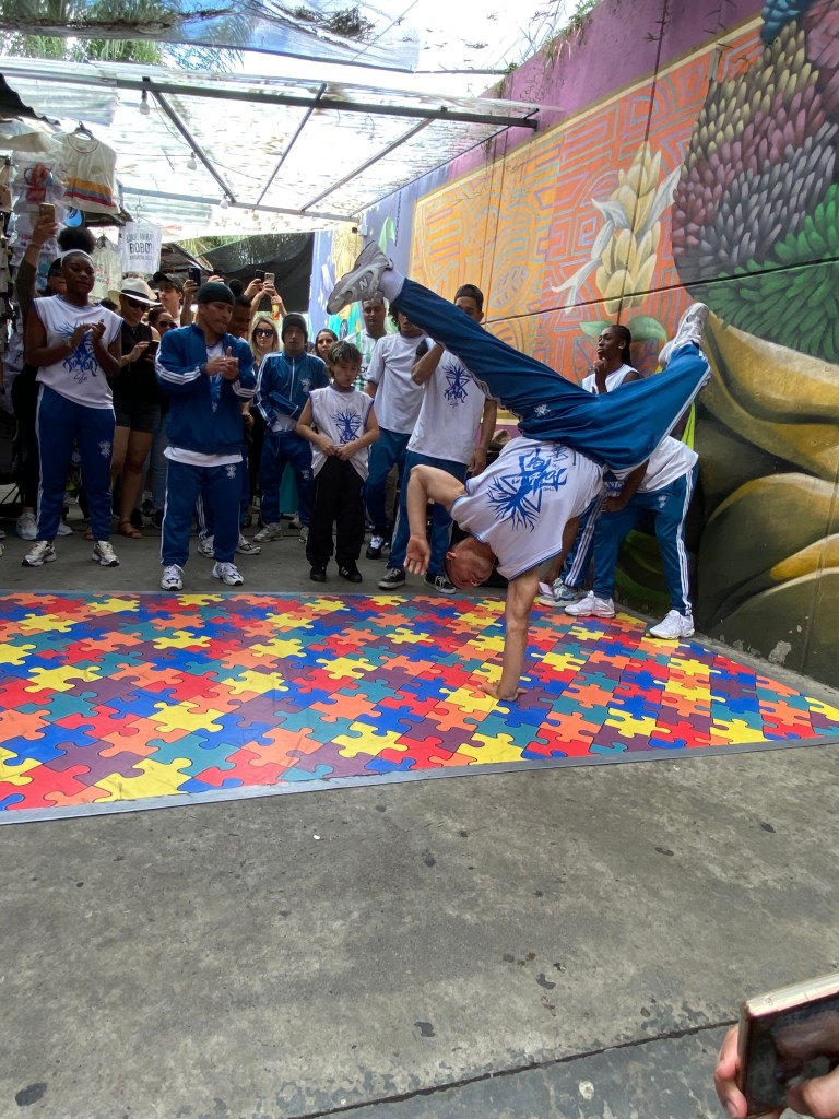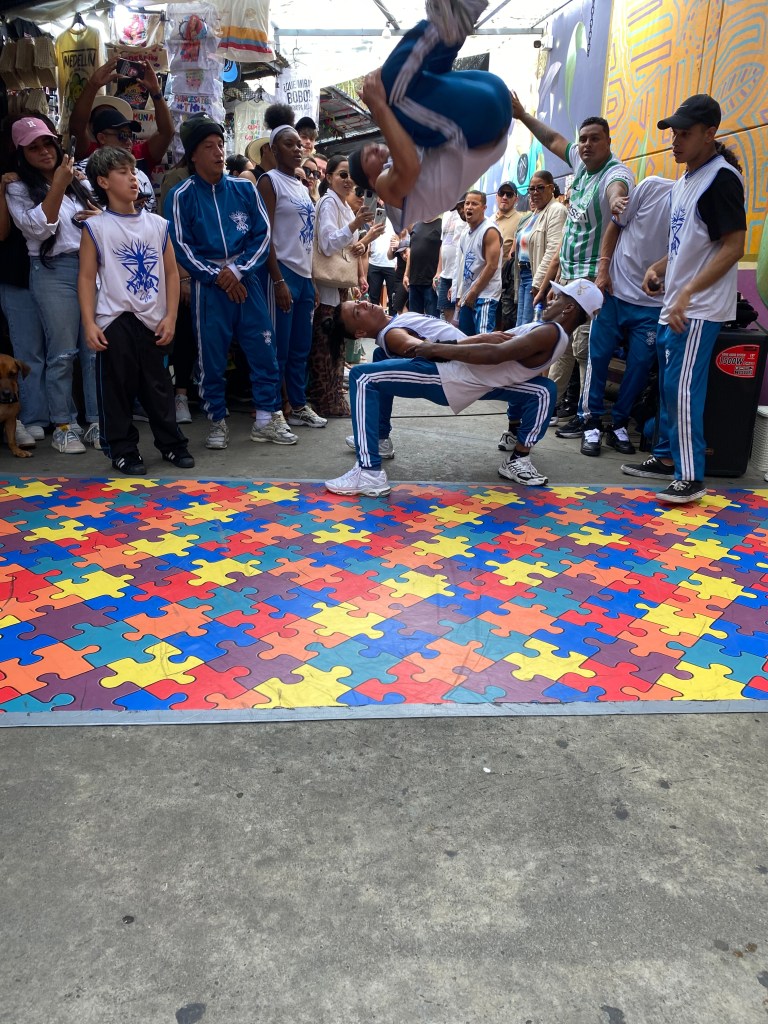 Our first stop was to watch some street performers. Break dancing is big in Medellin and especially Comuna 13. I think most tour guides take their groups to see groups perform. Different dance troupes take the makeshift “stage” along the rows of merchant stalls. Crowds gather for every performance. Our guide took us to see Power of Light. They are apparently a favorite on the Colombian stage.