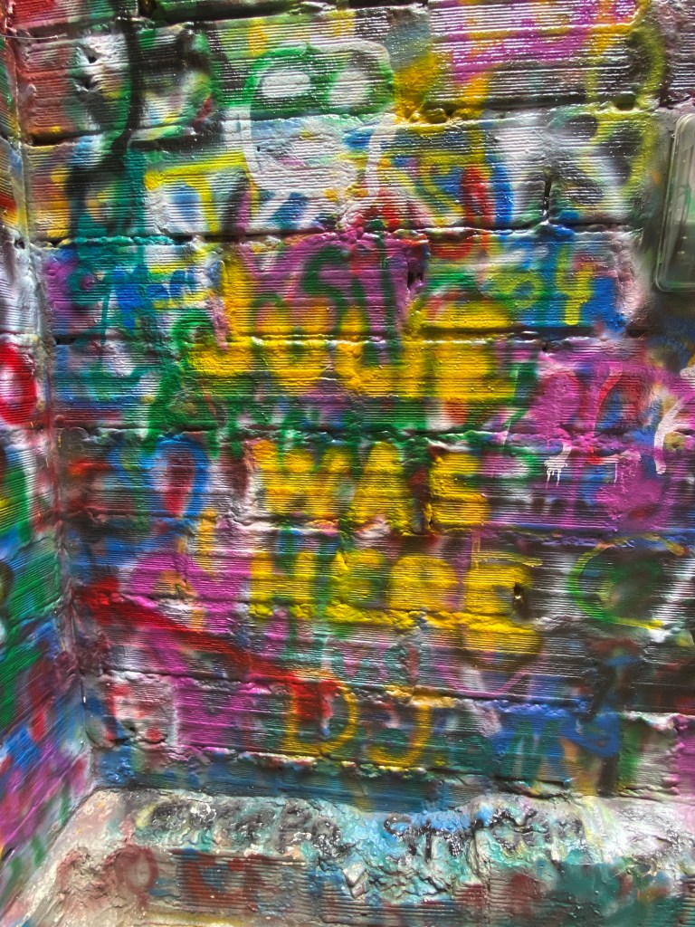 None of these things turned out to be true. But I followed them all and only had a few remaining minutes to find the meeting spot for my tour. There were many to choose from, but I went with Medellin Memories on Get Your Guide: Medellín: Comuna 13 Tour with Spray Painting and Street Food. I’d chosen this one because I’ve never spray-painted graffiti before. There are several Comuna 13 tours, each with its own angle. I think I made a great choice, though I’m not much of an artist. (Which I knew, but ignored when I made my choice.) Still, I made my mark on Comuna 13 for posterity: