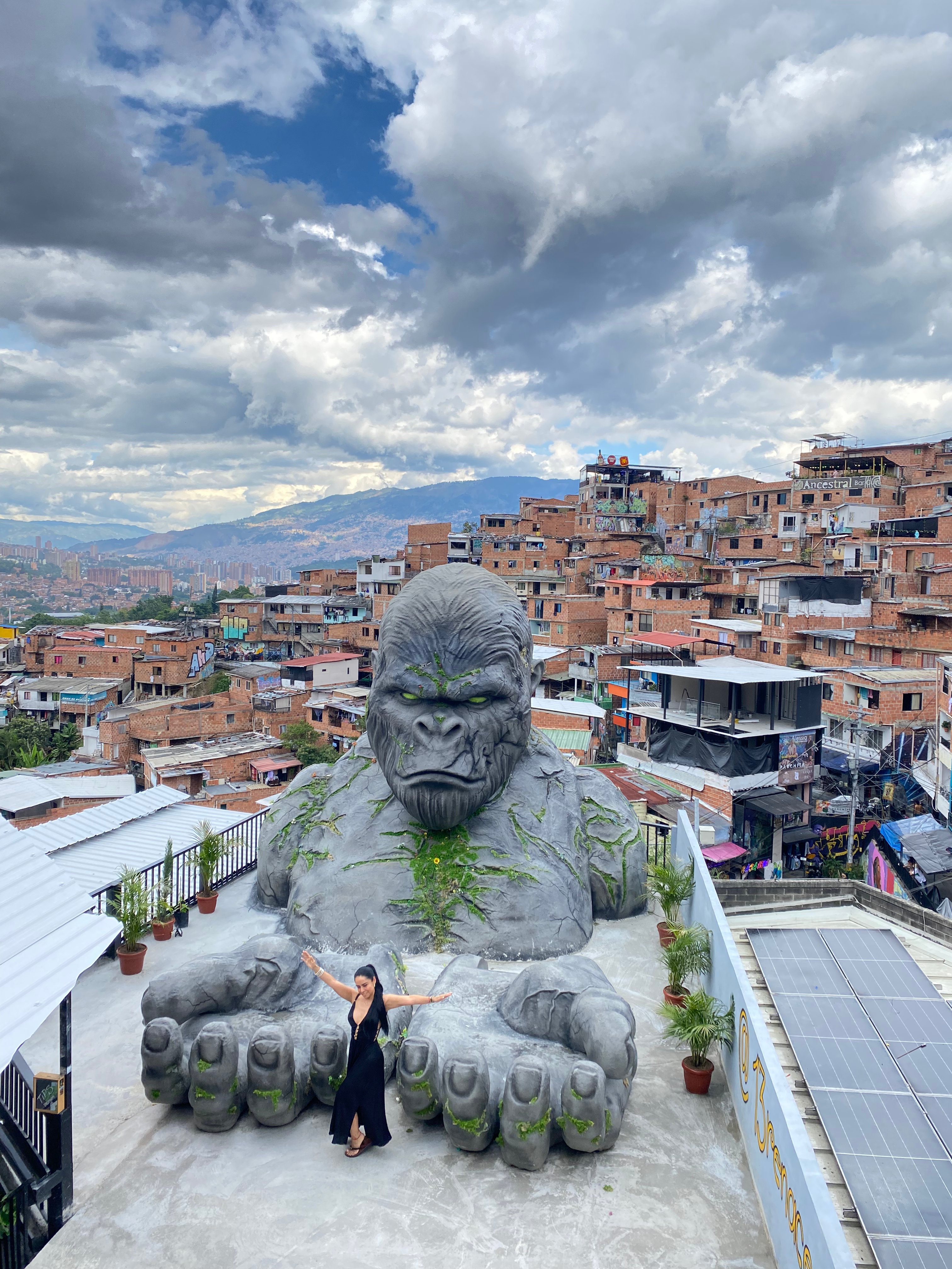 The restaurant overlooks a gorilla statue where I watched dozens of people taking photos as we nibbled on wonderful plantains, pork sausages, and other bites of flavorful food. I recommend POLLO for good food and drinks along with a spectacular view over Comuna 13.